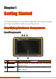 Chapter 1 Getting Started This chapter introduces you to the external components of your device and guides you through the process of setting up your device for use. Identifying Hardware Components Front Components Ref Component Description Camera lens Takes still pictures or records video clips. The front lens supports 2 MP. Light sensor Senses the ambient light for automatic adjustments of the display backlight.