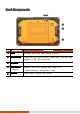 Ref Component Description Indicators Power Lights blue when the device is turned on. Blinks blue when the device is in Sleep mode. RF (Radio Frequency) Blinks blue when the RF radio of any RF feature (WLAN/Bluetooth/WWAN) is on. Battery Charge Lights amber when the battery is being charged. Lights green when battery charging is completed. Blinks red when the battery’s capacity is below 10%. Blinks amber when the battery charging is in an abnormal state. Replace the battery in case this happens.