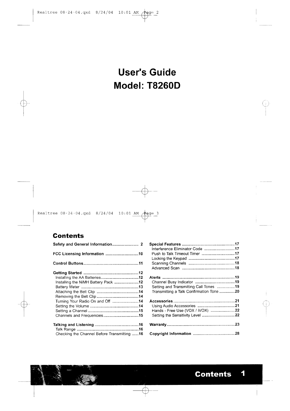 Eritrea 08-24 8/24/04 18:01 User's Guide Model: T8260D e 8/24/04 10:01 AM P Contents Safety and General information, Special Features .. Interference Eliminator Code Push to Talk Timeout Timer ., Locking the Keypad Scanning Channels Advanced Scan. FCC Licensing information Control Buttons... Getting Started Tantalizing the AA Installing the Nigh Battery Pack Battery Meter .. Attaching the Belt Clip . Removing the Belt Clip.