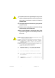 English 16) AUX_IN (AUX In Connector) Connect other device (such as PCI TV Tunner audio out) to the connector. 1 Pin No. Definition 1 2 AUX-L GND 3 GND 4 AUX-R 17) F_USB (Front USB Connector, Yellow) Be careful with the polarity of the front USB connector. Check the pin assignment while you connect the front USB cable. Please contact your nearest dealer for optional front USB cable. Be careful with the polarity of the F_USB connector.