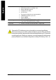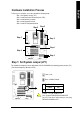 Step 5-2 : Connectors Introduction 1 3 5 9 17 8 11 2 10 4 15 12 13 16 6 7 14 1) CPU_FAN 2) SYS_FAN 10) SUR_CEN 11) CD_IN 3) 4) 5) 6) 12) 13) 14) 15) ATX (ATX Power) IDE1 / IDE2 FDD PWR_LED 7) F_PANEL 8) BATTERY 9) F_AUDIO AUX_IN SPDIF_IO F_USB1 / F_USB2 GAME 16) CI (Case Open) 17) CLR_CMOS - 13 - Hardware Installation Process English { Line In jack Devices like CD-ROM, walkman etc. can be connect to Line In jack.