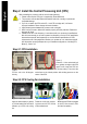 English Step 2: Install the Central Processing Unit (CPU) Before installing the processor, adhere to the following warning: 1. Please make sure the CPU type is supported by the motherboard. 2. The processor will overheat without the heatsink and/or fan, resulting in permanent irreparable damage. 3. If you do not match the CPU socket Pin 1 and CPU cut edge well, it will cause improper installation. Please change the insert orientation. 4. Apply therm al grease between the processor and cooling fan. 5.