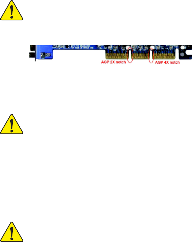 When you installing AGP card, please make sure the following notice is fully understood and practiced. If your AGP card has "AGP 4X notch"(show below), please make sure your AGP card is AGP 4X (1.5V). Do not use AGP 2X card (3.3V) in this motherboard. It will burn and damage the motherboard due to Intel® 845(E/G) / 850(E) chipset can't support AGP 2X(3.3V). Example 1: Diamond Vipper V770 golden finger is compatible with 2X/4X mode AGP slot. It can be switched between AGP 2X(3.3V) or 4X (1.