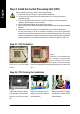 English Step 2: Install the Central Processing Unit (CPU) Before installing the processor, adhere to the following warning: 1. Please make sure the CPU type is supported by the motherboard. 2. The processor will overheat without the heatsink and/or fan, resulting in permanent irreparable damage. 3. If you do not match the CPU socket Pin 1 and CPU cut edge well, it will cause improper installation. Please change the insert orientation. 4. Apply thermal grease between the processor and cooling fan. 5.