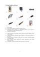 Součásti dodávky přístroje 1.) Měřící přístroj 2.) Síťový nabíjecí adaptér s konektorem (jackem) 2,0 mm 3.) Uzemňovací kabel o délce 5 m s konektorem (jackem) 2,5 mm (mono) a krokosvorkou k provedení uzemnění přístroje 4.) Uzemňovací krokosvorka 5.) Adaptér (konektor) pro provádění měření s bajonetovou zdířkou (BNC) a jackem 3,5 mm (mono) 6.) Adaptér (konektor) pro provádění měření se zdířkou 3,5 mm (mono) a jackem 2,5 mm (mono) 7.