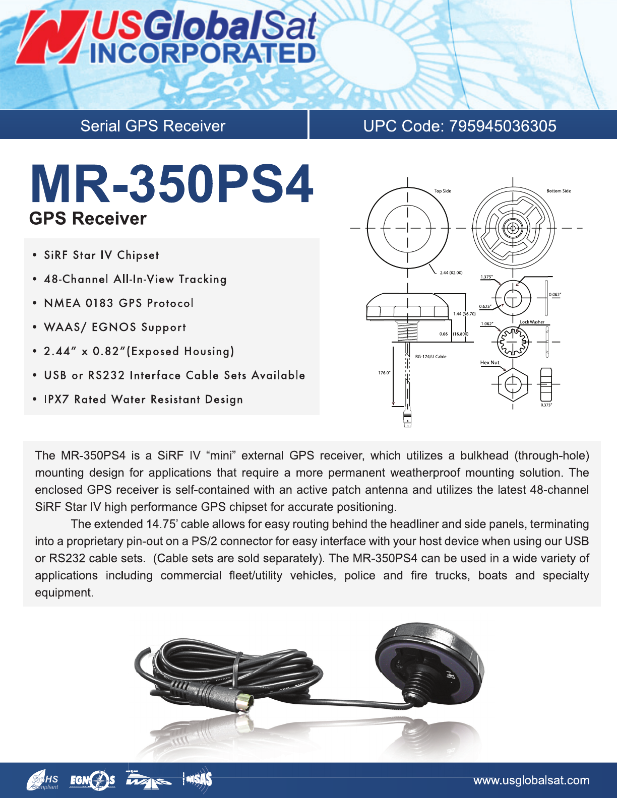 GlobalSat SiRF Star IV Serial GPS Receiver Bulk Head Mount (MR-350P-S4)