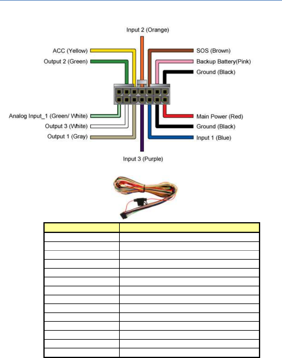 TR-606B Installation Guide Cable description 14 Pin I/O Cable Wire Color Green/ White White Gray Purple Blue Black Red Description Analog Input_1 Digital Output 3 (Negative Trigger) Digital Output 1 (Negative Trigger) Digital Input 3 (Positive Trigger) Digital Input 1 (Negative Trigger) Ground Main Power Green Yellow Orange Brown Pink Black Digital Output 2 (Negative Trigger) ACC (Positive Trigger) Digital Input 2 (Negative Trigger) SOS (Negative Trigger) 12V/24V Backup Battery Ground