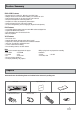 Technical Specifications Inputs Outputs AUDIO 2 Stereo audio inputs, RCA Connector, -8dbm, 47KΩ, front and rear VIDEO 2 Composite video inputs, RCA Connector, 75Ω, 1Vp-p RF Antenna or CATV Input, F-Connector, 75Ω AUDIO 1 Stereo audio outputs, RCA Connector, -8dbm, 1.5KΩ AUDIO (DVD only) 2 Digital audio outputs (1 optical, 1 coaxial) 1 Stereo audio outputs VIDEO 1 Composite video output, RCA Connector, 75Ω, 1Vp-p VIDEO (DVD only) 1 S-Video output, S-Connector, 75Ω, Y=1.0Vp-p, C=0.