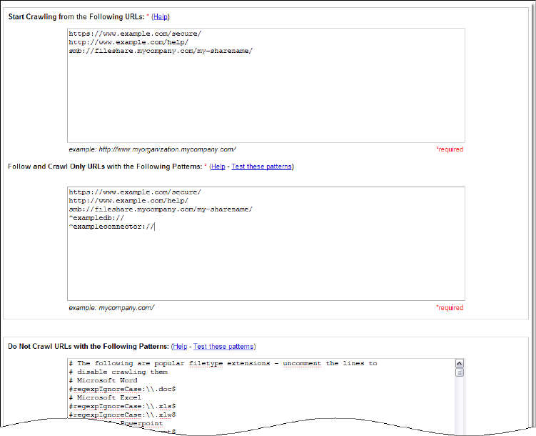 2. Specifying links for the search appliance to follow and index by listing patterns in the Follow and