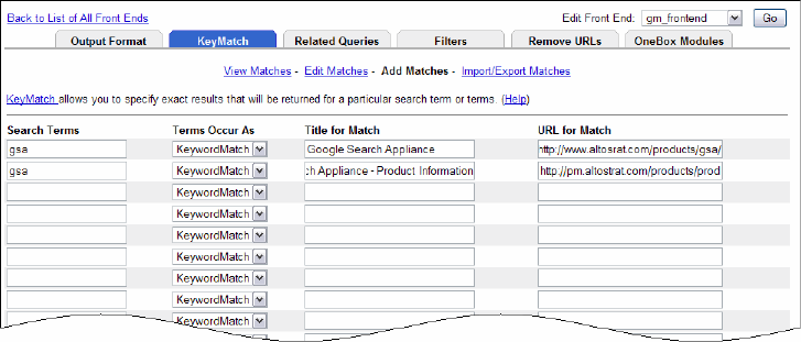 In the preceding example, there are two KeyMatches for the search term “gsa.” In the first KeyMatch: