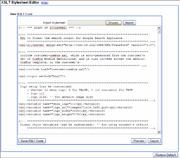 the XSLT Stylesheet Editor on the Serving > Front Ends >Output Format page.