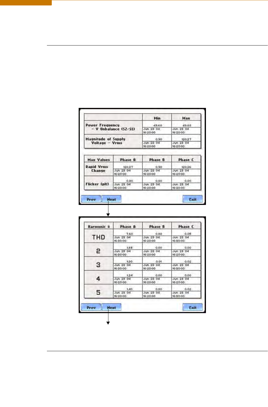 and RMS Voltage along with the time and date of occurrence. Maximum phase values