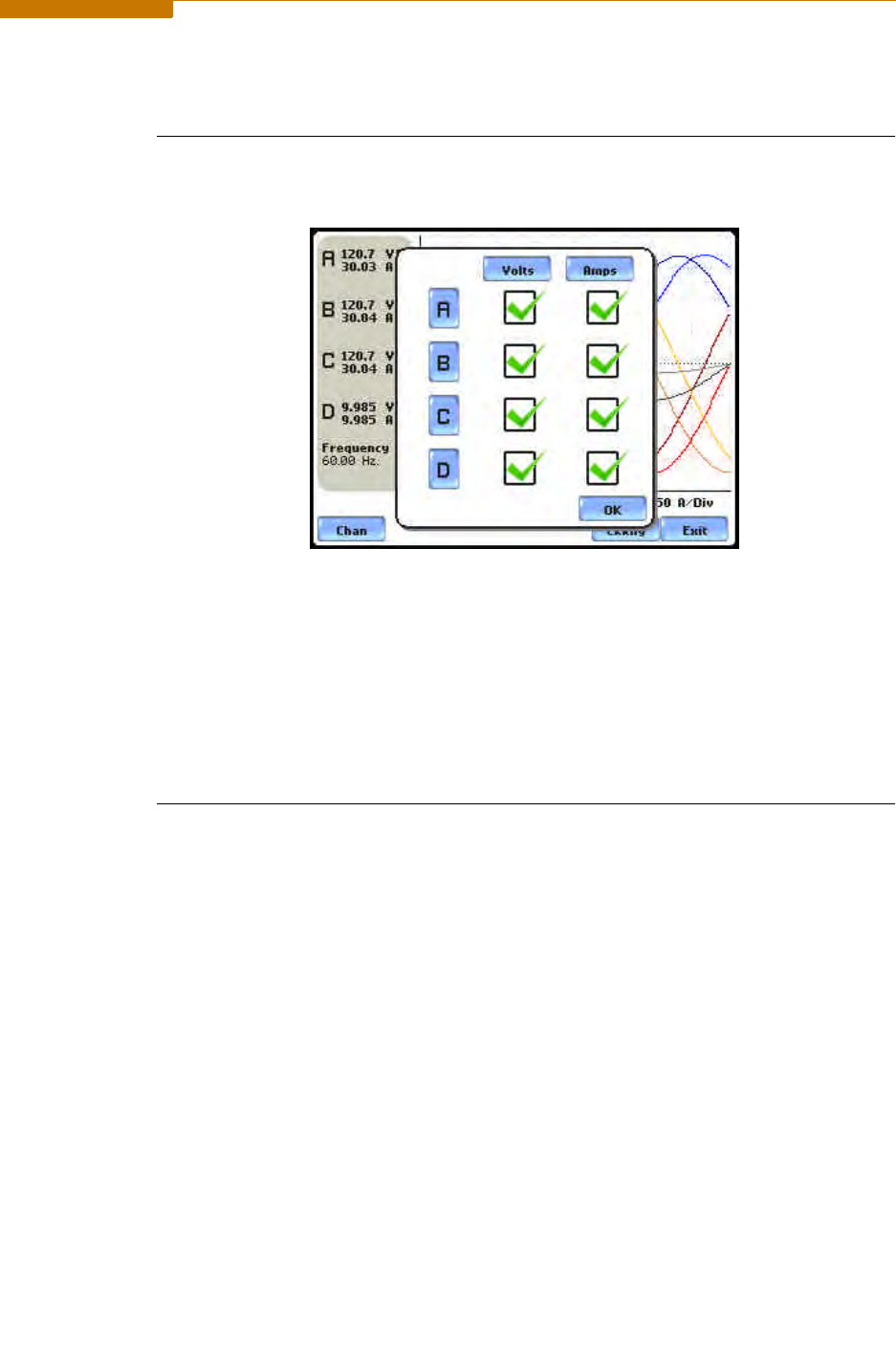 From the Scope mode screen, press Chan to turn Volts/Amps channel selection on/off.