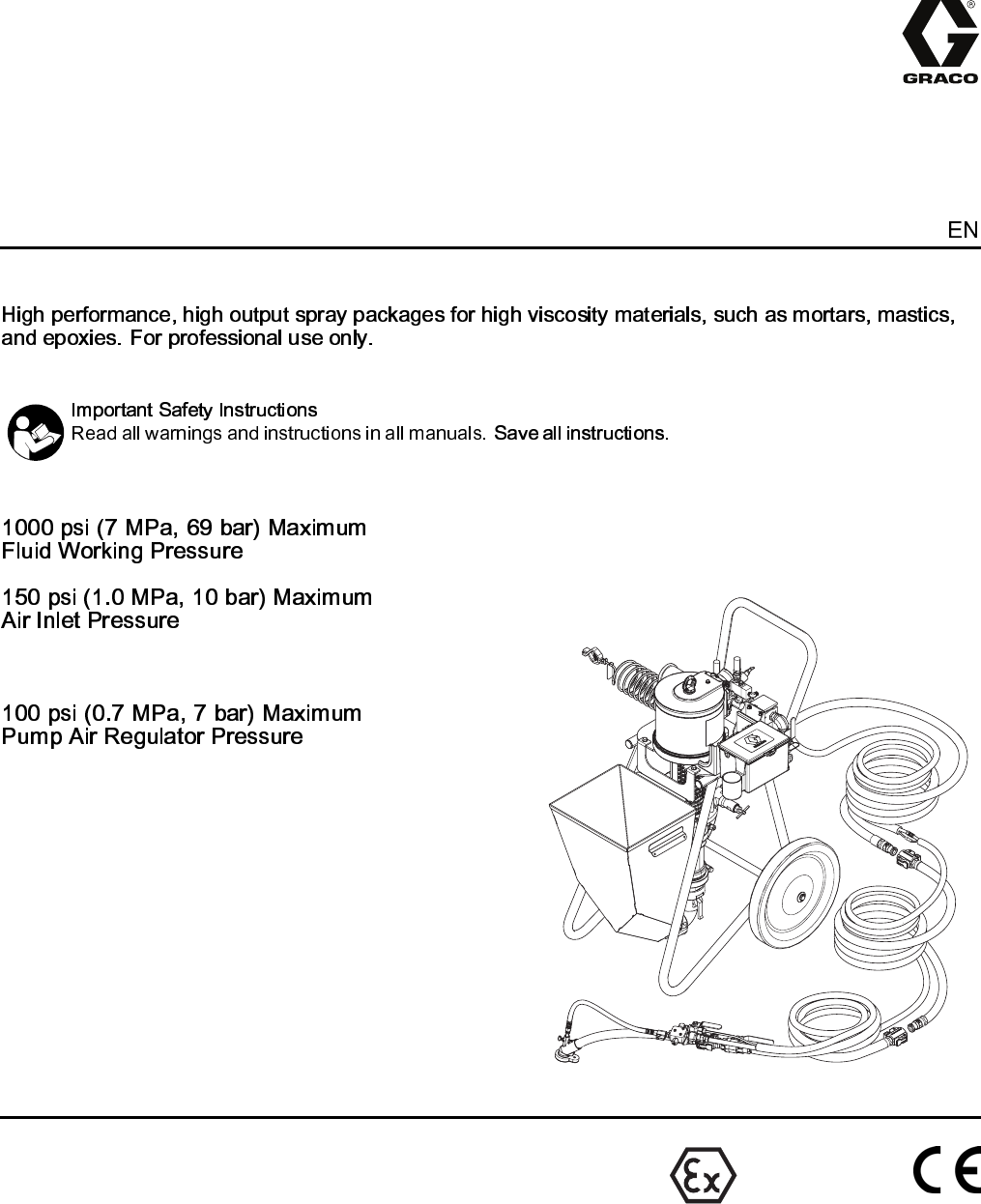 Instructions - Parts M680 Mortar Sprayer 332612A EN High performance, high output spray packages for high viscosity materials, such as mortars, mastics, and epoxies. For professional use only. Important Safety Instructions Read all warnings and instructions in all manuals. Save all instructions. 1000 psi (7 MPa, 69 bar) Maximum Fluid Working Pressure 150 psi (1.0 MPa, 10 bar) Maximum Air Inlet Pressure 100 psi (0.