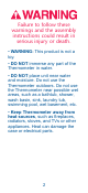 Si no obedecen estas advertencias y se siguen las instrucciones de montaje podría resultar en lesiones serias o la muerte. • ADVERTENCIA: Este producto no es un juguete. • NO sumerja ninguna parte del Termómetro en agua. • NO ponga el termómetro cerca del agua o humedad. No use el Termómetro a la intemperie. No use el Termómetro cerca de posibles lugares húmedos, tales como una bañera, ducha, lavadero, fregadero, lavarropa, piscina, sótano húmedo, etc.