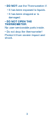 '2 127 XVH WKH 7KHUPRPHWHU LI ,W KDV EHHQ H[SRVHG WR OLTXLGV ,W KDV EHHQ GURSSHG RU LV GDPDJHG '2 127 23(1 7+( 7+(5020(7(5 1R XVHU VHUYLFHDEOH SDUWV LQVLGH 'R QRW GURS WKH WKHUPRPHWHU 3URWHFW LW IURP VHYHUH LPSDFW DQG VKRFN