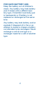 PARA UN USO SEGURO DE LA PILA: Mantenga la pila fuera del alcance de los niños. Cualquier pila puede perder ácido si se mezcla con un tipo de pila diferente, si se la coloca de manera incorrecta (puesta al revés) o si todas las pilas no se cambian o recargan al mismo tiempo. Cualquier pila puede perder ácido o explotar si se la desecha en el fuego o se trata de cargar una pila que no debe ser recargada. Nunca recarga una pila de un tipo en un cargador hecho para una pila de otro tipo.