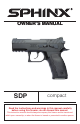 PACKAGE CONTENTS • [1] SDP Compact 9mm • [1] Owner’s Manual • [2] Magazines • [1] Cleaning Kit • [3] Grips (Medium size installed) • [1] Sphinx Pistol Case • [1] Magazine Loader • [1] Grip Removal Tool TECHNICAL SPECIFICATIONS Caliber 9 x 19mm Overall length 7.4in / 188.49mm Overall height 5.35in / 135.9mm Overall Width 1.37in / 35.0mm Weight (without magazine) 27.5oz / 780g Barrel length 3.7in / 95mm Sight radius 5.