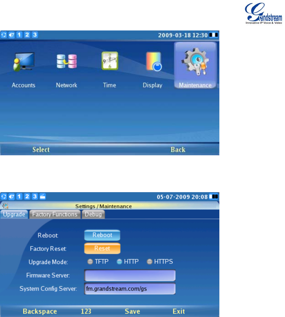Step 3: Press “Select” (F1 or the OK button) to access the Maintenance page. In the Upgrade tab, press