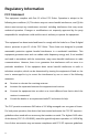 Regulatory Information FCC Statement This equipment complies with Part 15 of the FCC Rules. Operation is subject to the following two conditions: (1) This device may not cause harmful interference, and (2) this device must accept any interference received, including interference that may cause undesired operation. Changes or modifications not expressly approved by the party responsible for compliance could void the user’s authority to operate the equipment.