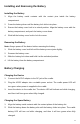 Installing and Removing the Battery Installing the Battery 1. Align the battery metal contacts with the contact pins inside the battery compartment. 2. Press the battery down until the battery lock clicks into place. 3. Ensure the battery cover lock is in unlock position. Align the battery cover with the battery compartment; and push the battery cover down. 4. Slide left the battery cover lock to lock the cover. Removing the Battery Note: Always power off the device before removing the battery. 1.