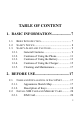 TABLE OF CONTENT 1. BASIC INFORMATION .................... 7 1.1. BRIEF INTRODUCTION........................................... 7 1.2. SAFETY NOTICE .................................................... 8 1.3. SAFETY ALERT AND CAUTIONS ............................. 9 1.3.1. General Cautions ....................................... 9 1.3.2. Cautions of Using the Phone................... 11 1.3.3. Cautions of Using the Battery ................. 13 1.3.4. Cautions of Using the Charger ................ 15 1.3.5.