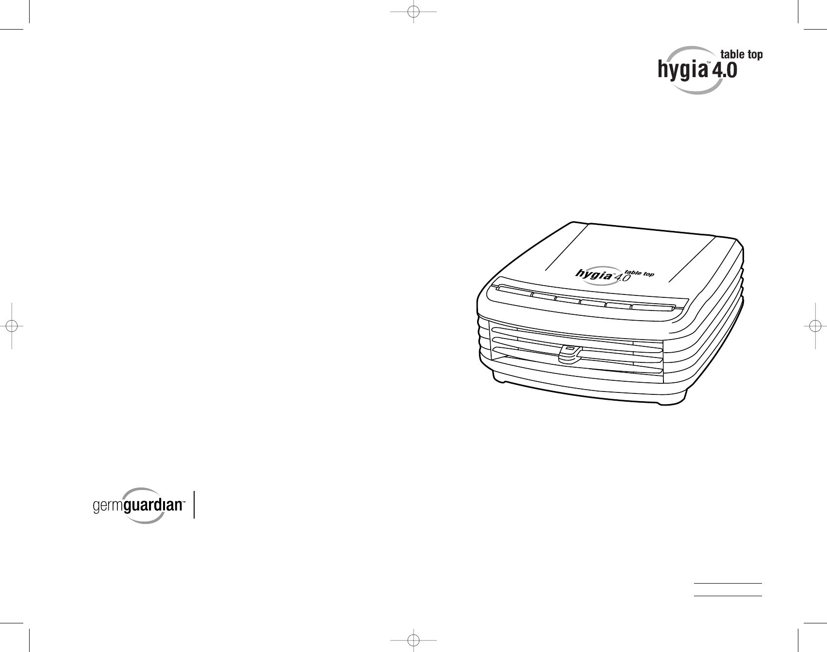 Hygia 4.0 3L rev.: Hygia 4.0 3L rev. 11/17/06 2:04 PM Page 1 Germ Guardian™ Hygia 4.0 Table Top Air Purifier USE & CARE INSTRUCTIONS www.germguardian.com 1-866-603-5900 Guardian Technologies LLC 26201 Richmond Road, Unit A3 · Bedford Heights, OH 44146 1-866-603-5900 · www.germguardian.com ©2006 Guardian Technologies LLC S-7 English Manual..........................................................E-1 French Manual ..........................................................F-1 Spanish Manual ..........