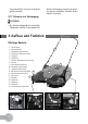 Dansk 3 Konstruktion og funktion Vigtige komponenter 1. Skubbehåndtag 2. Skidtkasse 3. Håndtag til skidtkasse 4. Skivebørste højdeindstilling 5. Bærehåndtag 6. Skivebørste 7. Sidelederrulle (ikke 475) 8. Kørehjul 9. Fintsnavs-børste 10. Kædeguide (ikke 475) 11. Støvfilter (ikke 475) 12. Maskinnummer (477/497) 13. Maskinnummer (475) 7 14. Skråhjul 15. Fejelæbe 16. Fejeplade 17. Kobling 18. Tandmuffe 19.