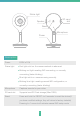 Status light SD card slot Speaker Reset Microphone Power Description Power DC5V±10% Status light Red light solid on: the camera network is abnormal Blinking red light: awaiting WiFi connecting, or currently connecting (faster blinking) Blue light solid on: camera running correctly Blinking blue light: awaiting manual WiFi configuration, or currently connecting (faster blinking) Microphone Captures sounds for your video SD card slot Supports local SD Card storage (Max.