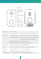 Speaker Status light Microphone Lens Photosensitive PIR Reset Micro USB Charging indicator Power button SD card slot Power port DC 5V±10% Power on/off Press the button for 3 seconds to turn on/off the camera Status light Solid red light on: the camera is turning on or malfunctional Blinking red light: awaiting WiFi connection (slowly blinking) connecting the WiFi (quickly blinking) Blinking blue light: currently connecting Solid blue light on: the camera runs correctly SD card slot Support local S
