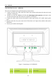User’s Manual OPERATING INSTRUCTIONS GENERAL INSTRUCTIONS Press the power button to turn the monitor on or off. The other control buttons are located on the front panel of the monitor (See Figure 5). By changing these settings, the picture can be adjusted to your personal preferences. • The power cord should be connected. • Connect the Signal cable from the monitor to the VGA card. • Press the power button to turn on the monitor. The power indicator will light up.