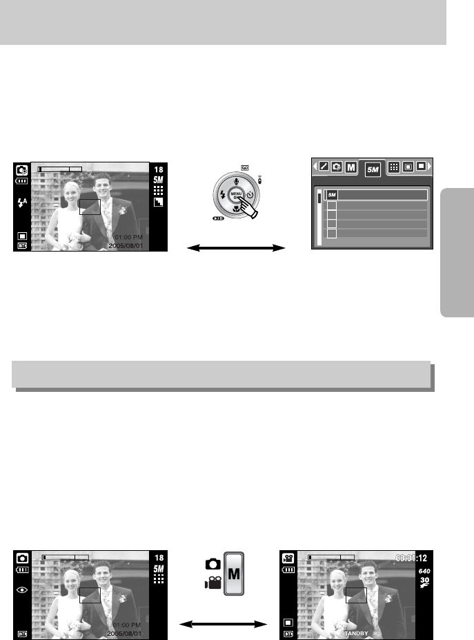 - When you press the MENU button, a menu related to each camera mode will be displayed