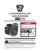 2.5 HP HORIZONTAL OHV GASOLINE ENGINE Model 97964 Set up, Operating, and Servicing Instructions Using an engine indoors CAN KILL YOU IN MINUTES. Engine exhaust contains carbon monoxide. This is a poison you cannot see or smell. NEVER use inside a home or garage, EVEN IF doors and windows are open. Only use OUTSIDE and far away from windows, doors, and vents. Visit our website at: http://www.harborfreight.com Read this material before using this product. Failure to do so can result in serious injury.