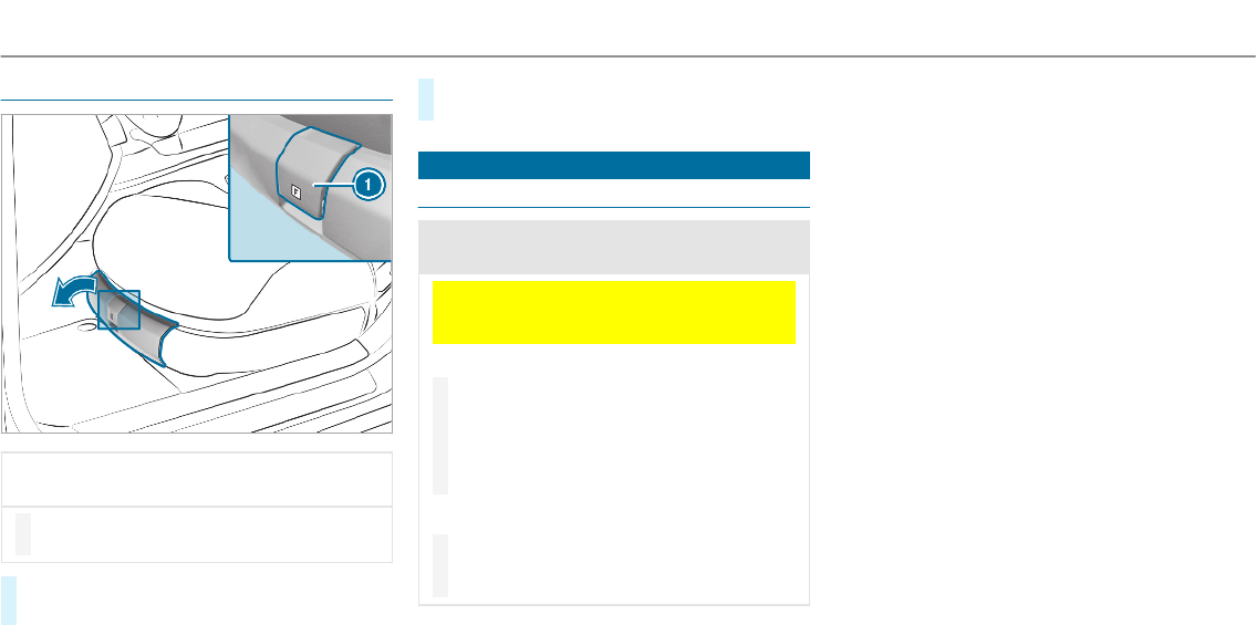 Breakdown assistance 485 4MATIC vehicles # Make sure that the front and rear axles come to rest on the same transportation vehicle. Towing eye storage location Installing the towing eye Towing eye 1 is located with the vehicle tool kit under the boot floor. * NOTE Damage to the drivetrain due to incorrect positioning # Do not position the vehicle above the connection point of the transport vehi‐ cle. # # Press the mark on cover 1 inwards and remove.