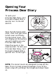 Opening Your Princess Dear Diary To open your Princess Dear Diary, turn the heart-shaped latch a quarter turn to the left and lift. Open the left-hand locket cover, then the right-hand locket cover and finally, the top locket cover. This will display all the buttons you will need to use your Princess Dear Diary. Close the covers in the reverse order. To lock your Princess Dear Diary, turn the heart-shaped latch a quarter turn to the right.