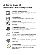 A Quick Look at Princess Dear Diary Icons THINGS TO REMEMBER You can save dated messages of fifteen characters each. CALCULATOR You use this for basic math functions. THINGS TO DO You can save messages for an exact time and date. FRIENDS & FAMILY You can save the names, phone numbers and birthdays of special people. PASSWORD You can create a four character password to protect your files from nosey people. STUFF You can save one list that holds up to fifty characters.