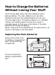 Replacing the Backup Battery Note: This battery was installed at the factory and, with normal use, should not need changing for 24 months after you begin using your Princess Dear Diary. Using a Phillips® screwdriver, remove the screw on the small battery compartment door. Lift and remove the battery compartment door. Remove the CR2032 button cell battery and replace it with one of the same type. The “+” should be facing you. Replace the battery compartment door and screw.