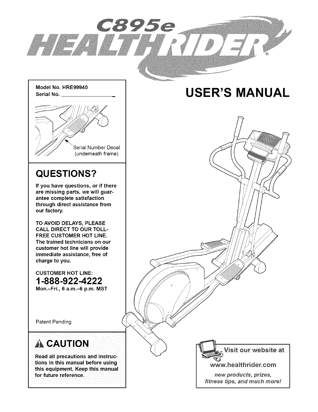 BEFORE YOU BEGIN Congratulations for selecting the new HealthRider _ C895e elliptical exerciser. The C895e is an incredibly smooth exerciser that moves your feet in a natural elliptical path, minimizing the impact on your knees and ankles. And the unique C895e features adjustable resistance and incline to help you get the most from your exercise. Welcome to a whole new world of natural, elliptical-motion exercise from HealthRider.