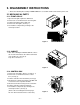 2. DISASSEMBLY INSTRUCTIONS — Before the following disassembly, POWER SWITCH is set to OFF and disconnected the power cord. 2.1 MECHANICAL PARTS 2.1.1 FRONT GRILLE 1. Open the inlet grille upward or downward. 2. Remove the screw which fastens the front grille. 3. Pull the front grille from the right side. 4. Remove the front grille. (See Fig. 1) 5. Re-install the component by referring to the removal procedure. Figure 1 2.1.2 CABINET 1.