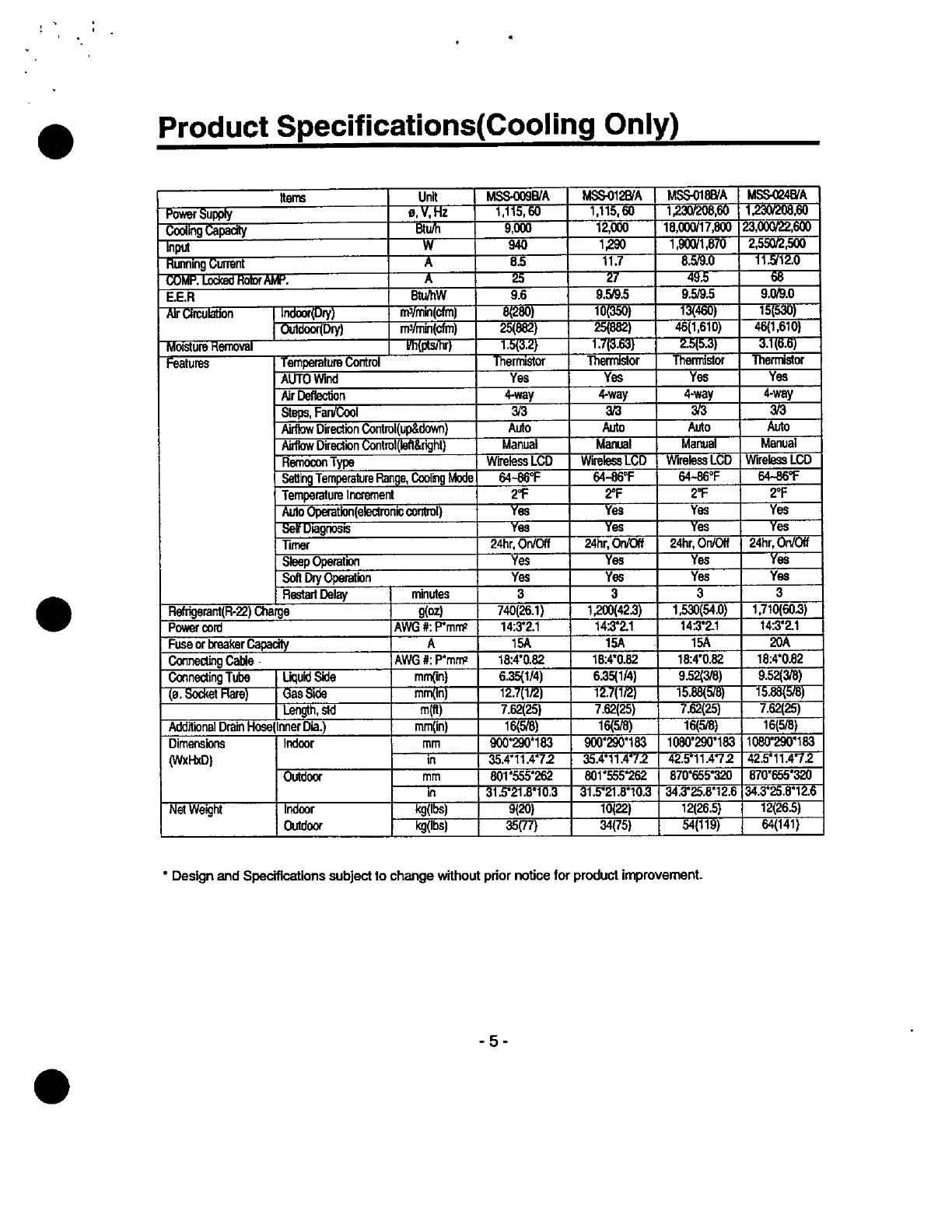 Specifications(Cooling