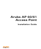 2 AP Deployment This chapter covers the following topics: z z Physical mounting of the Aruba AP 60/61 Connecting the required cables Mounting the Aruba AP 60/61 When provisioning is complete, mount the Aruba AP 60/61 at its intended service location. The Aruba AP 60/61 Access Points with or without external antennas are intended only for installation in Environment A as defined in IEEE 802.3.af.