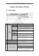 Network Video Recorder Quick Start Guide Chapter1 Description of Panels 1.1 Front Panel Figure 1. 1 Front Panel Table 1. 1 Description of Interfaces No. Name Function Description ALARM Turns red when a sensor alarm is detected. READY Turs blue when the device is functioning properly. Turns blue when device is controlled by an IR remote. STATUS Turns red when controlled by a keyboard and purple when IR remote and keyboard is used at the same time.