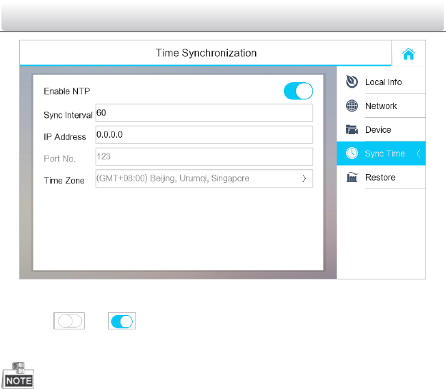 3. Set the synchronizing interval, enter the IP address of NTP server and port No., and