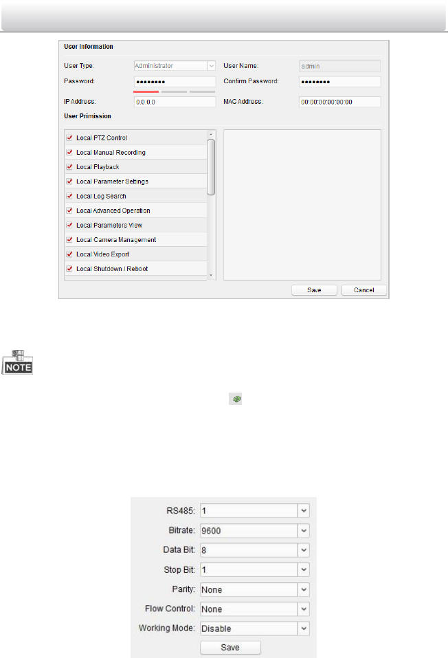 Click the RS485 button to enter the RS485 setting interface. You can view and edit the
