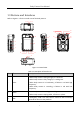 Body Camera User Manual 1.3 Buttons and Interfaces Refer to Figure 1-1 for the overall view of the body camera. 1 2 19 16 17 10 6 20 18 20 21 7 3 11 8 4 9 5 14 12 13 13 15 Figure 1-1 Overall View Table 1-1 Description of Overall View No. Button Description When body camera is being charged, it is solid red. When body camera is fully charged, it is solid green. 1 LED 1 When body camera is in low battery, it flashes in red with high frequency.
