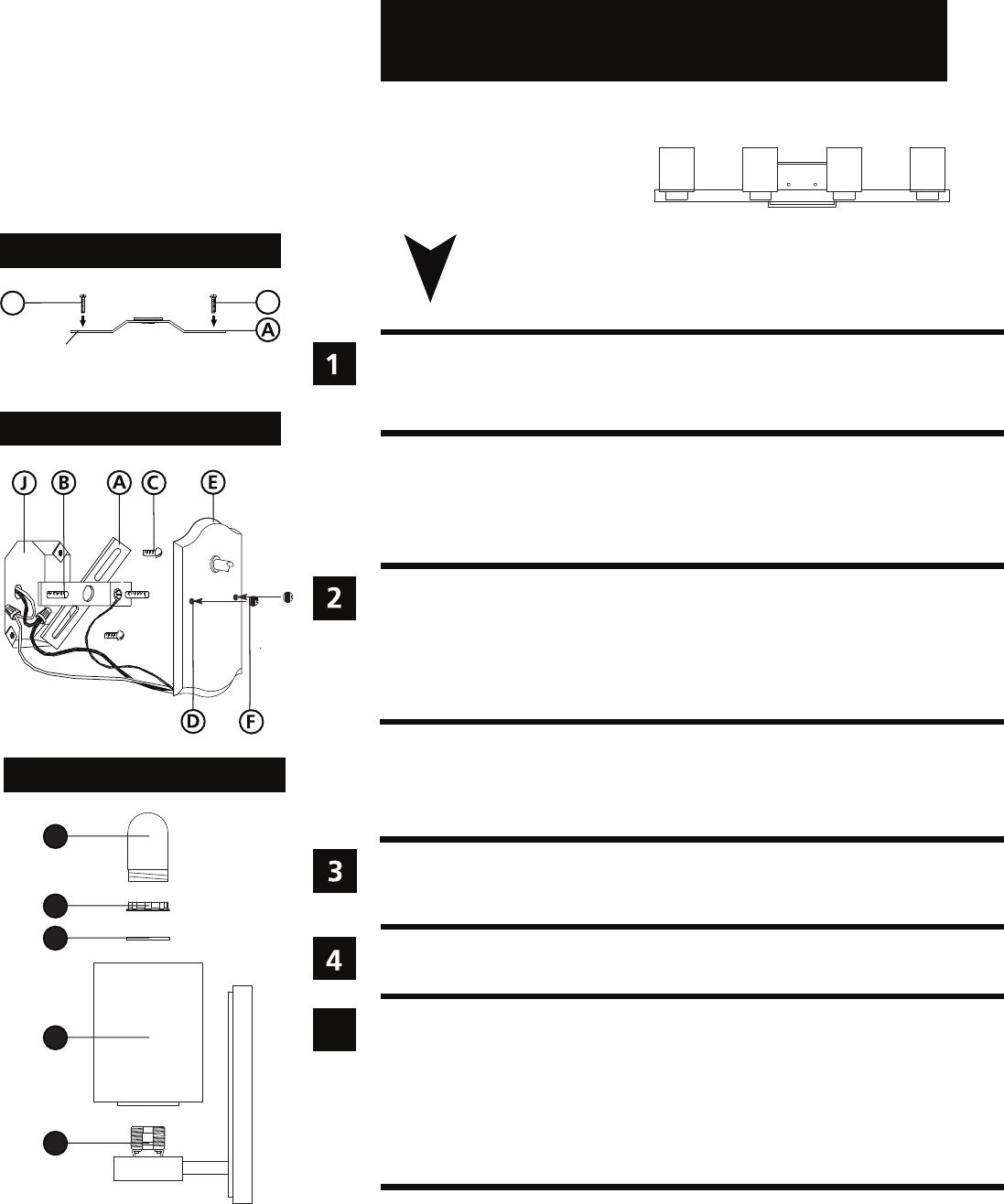 1. To mount fixture, slide backplate (E) over screws (B) and secure with ball knobs (F) -