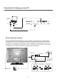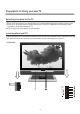 Preparation for Using your new TV Selecting a location for the TV 1)Place the TV on the floor or on a sturdy platform in a location where light does not directly hit the screen. 2)Place the TV far enough from the walls to allow proper ventilation. Inadequate ventilation may cause overheating, which may damage the TV. NOTE: Please contact local dealer for wall mounting. Learning about your TV You can operate your TV by using the buttons on the front panel or the remote control.