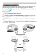 Connection to the ports (continued) To input SCART RGB signal; ex. SCART cable (plug) Audio L RCA plugs Audio R Video R SCART connector (jack) B G To input SCART RGB signal to the projector, use a SCART to RCA cable. Connect the plugs refer to above ex. For more reference, please consult your dealer.