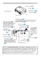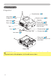 Part names Part names Projector ê Control buttons (6) Lamp cover (54) (Lamp unit is inside.) Remote sensor (16) Speaker Zoom ring (19) Security bar (10) (Use for attaching a commercial anti-theft chain or wire.) Focus ring (19) Vent Elevator button (9) Lens (17) Front-Right side Elevator foot (9) Lens cover (3) Filter cover (55) (Air filter and intake vent are inside.