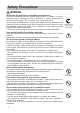 Safety Precautions (continued) NOTE About consumables. Lamp, LCD panels, polarizors and other optical components, and air filter and cooling fans have a different lifetime in each. These parts may need to be replaced after a long usage time. • This product isn’t designed for continuous use of long time.